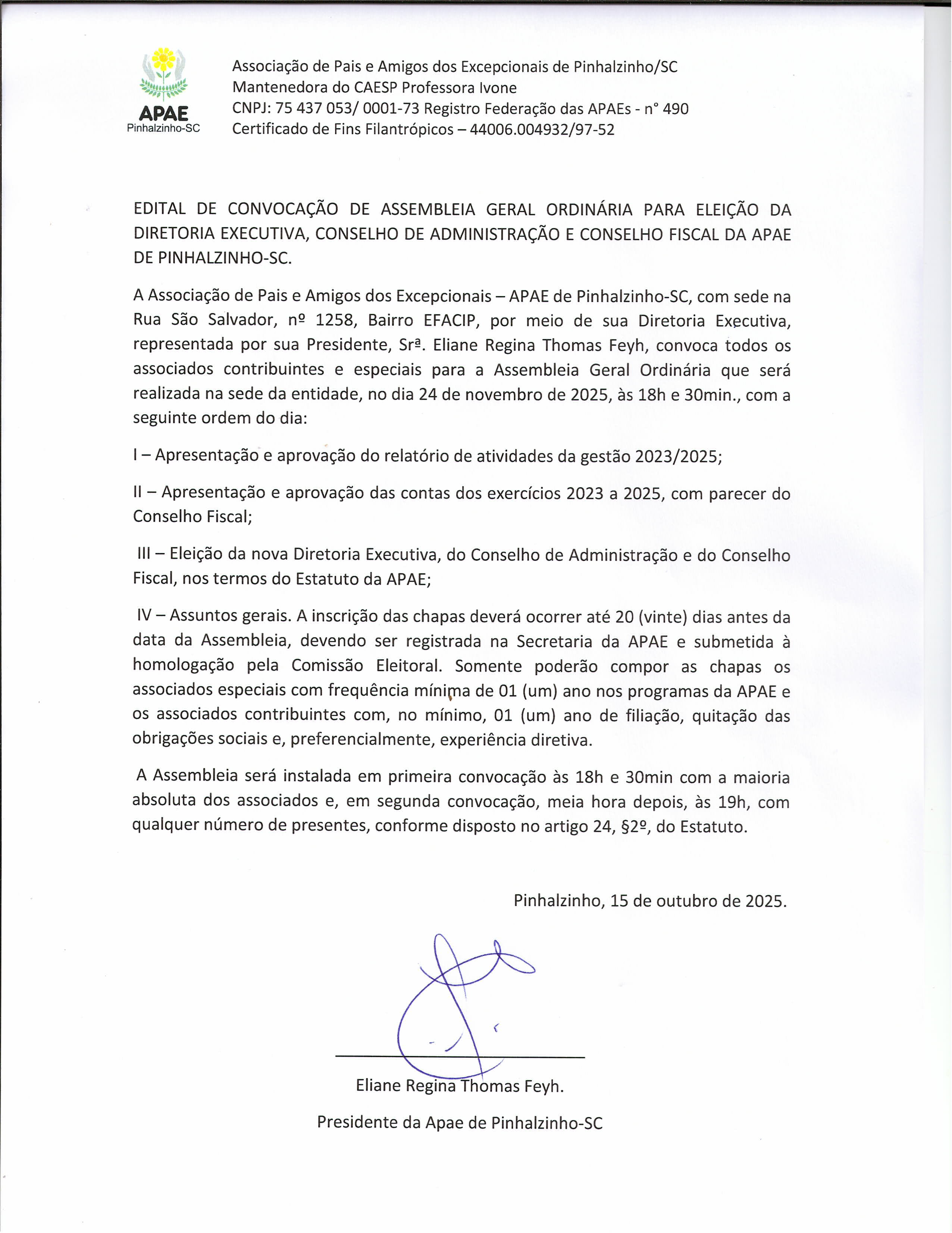 Edital de convocação de Assembleia Geral Ordinária para eleição da Diretoria Executiva, Conselho de Administração e Conselho Fiscal da Apae de Pinhalzinho-SC.